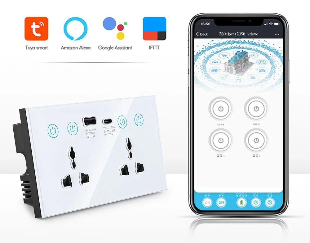 The Tuya WiFi 13A Smart Touch Wall Socket combines modern convenience with cutting-edge technology, offering a sleek double universal standard design with four power outlets and integrated USB-A and USB-C ports for versatile charging. Compatible with Tuya’s smart home ecosystem, it allows remote control, scheduling, and voice commands via Alexa or Google Assistant, making it perfect for both home and office use.
